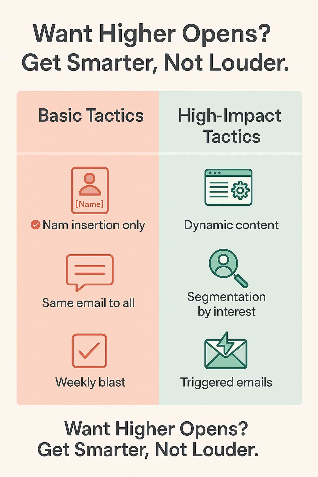 Mistake: Over-sending because you assume personalization means frequency. Even a well-personalized email that arrives too often annoys people. Clear expectation-setting in Email 1 helps (“We’ll email you no more than twice a week”) and segments inactive users differently.