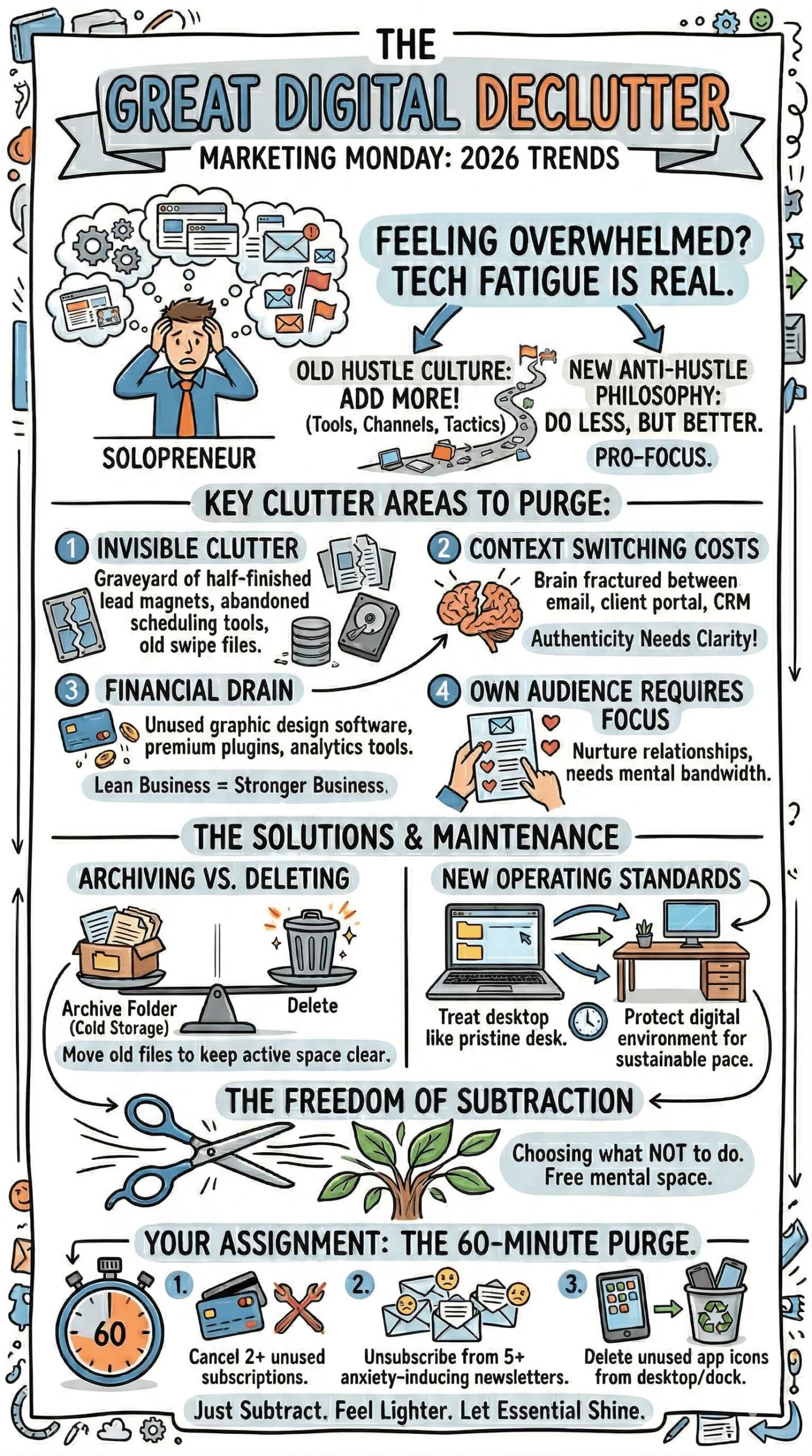 Tech fatigue is the silent killer of solopreneur creativity. If your computer is full of unused tools, unread emails, and abandoned projects, it is time for a massive digital declutter. True growth comes from doing less, but doing it… Share on X“Marketing Monday” articles archive.