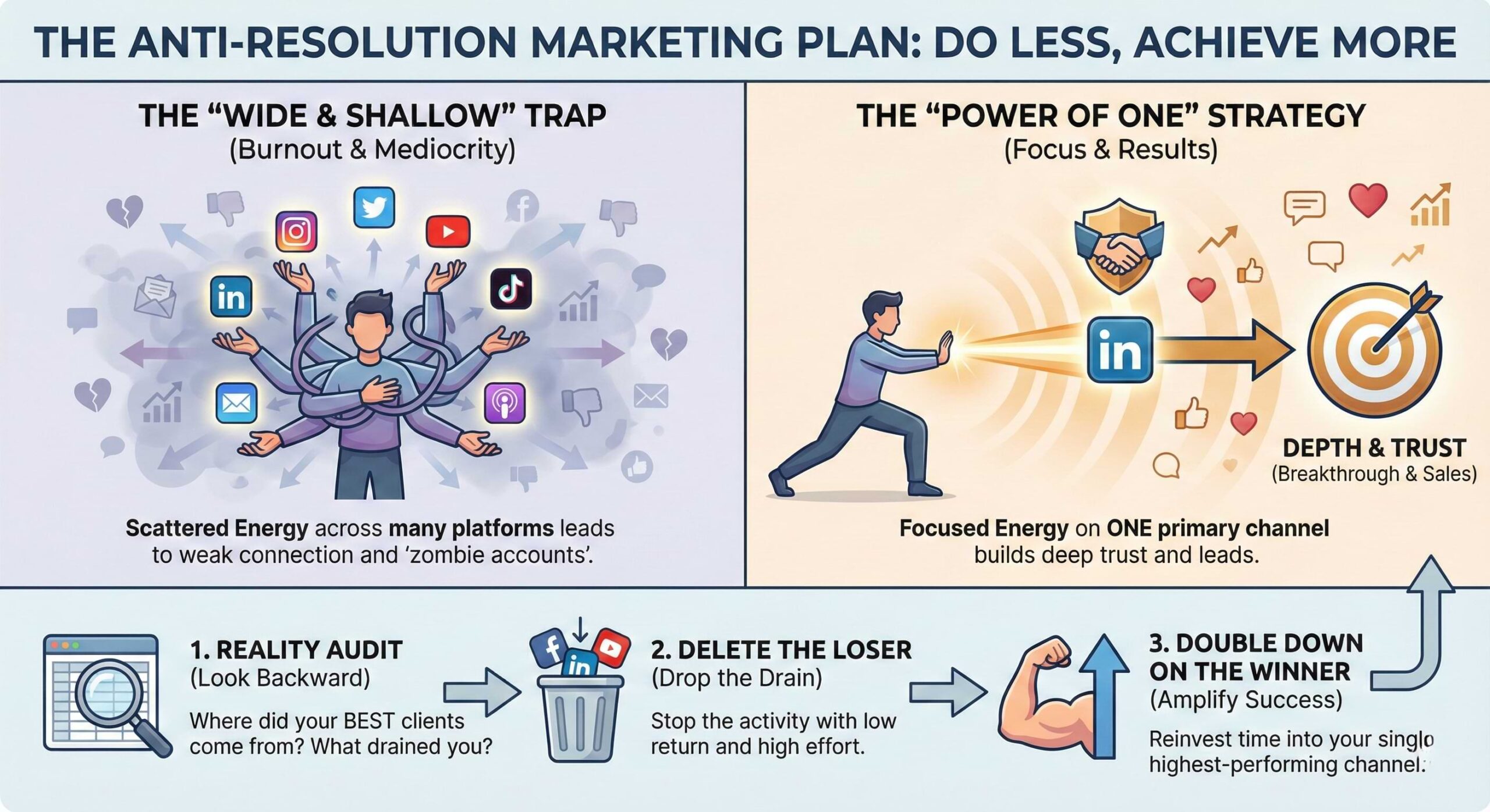 The Action Step: This week, identify your One Channel and your One Offer. Write them on a sticky note and put it on your monitor. Everything else is a distraction.