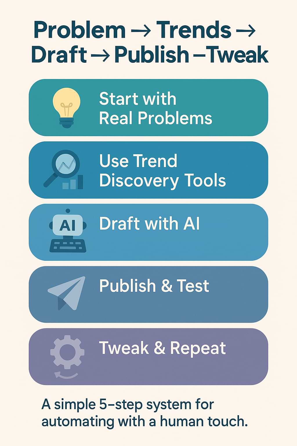 | 5. Tweak and repeat | Learn from early response. Adjust tone, format, message. Keep one problem at focus—not dozens. |