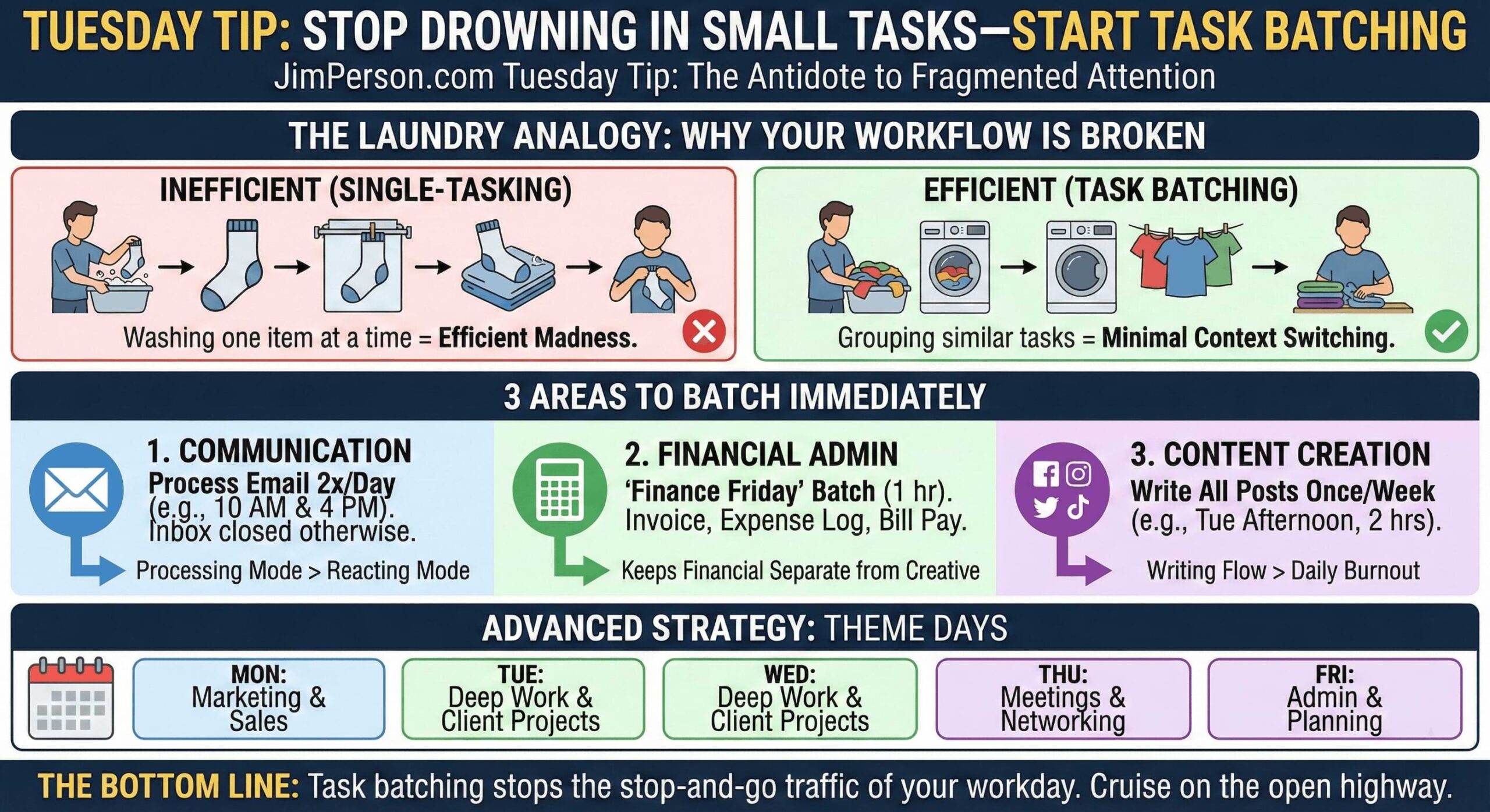 Once you master basic task batching, you can level up to “Theme Days.” This is where you dedicate entire days to specific functions of your business.