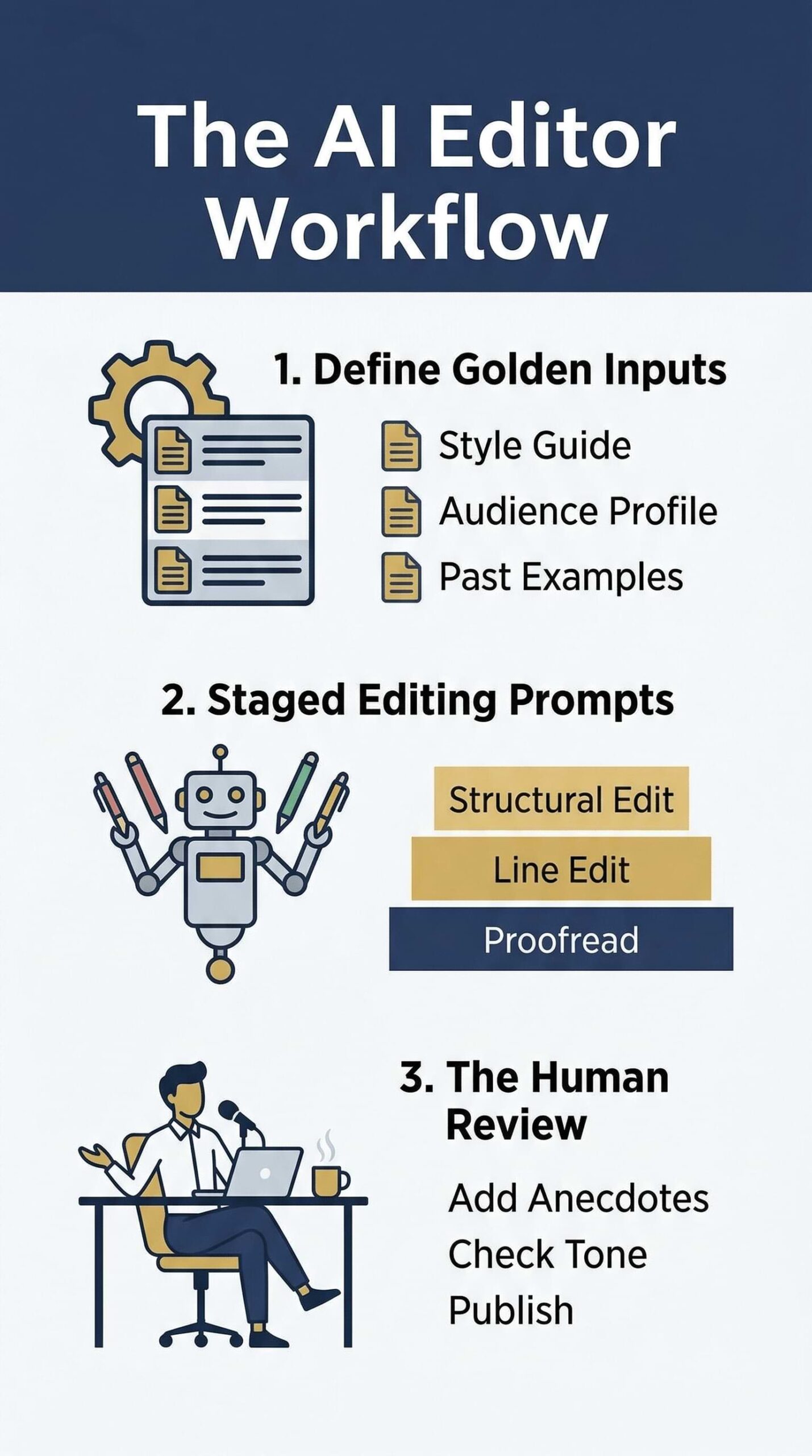 A professional human editor does not fix everything in one pass. They do a structural edit, a line edit, and a final proofread. Your AI Editor Workflow must mimic this exact staged approach.