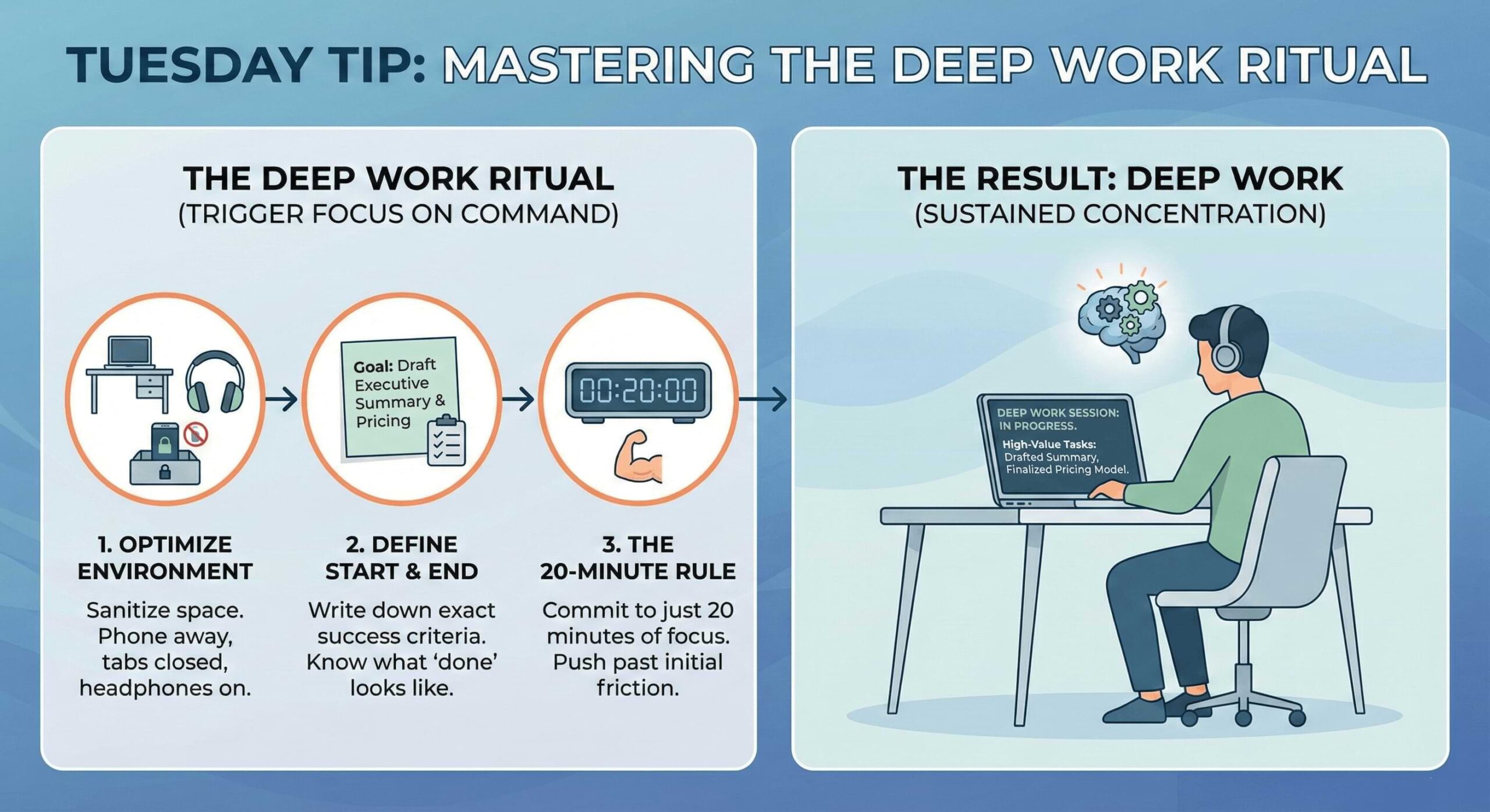 A ritual is a set of behaviors you perform the exact same way every time before you begin difficult work. It acts as a signal to your brain that it is time to shift gears from reactive mode to focused mode.