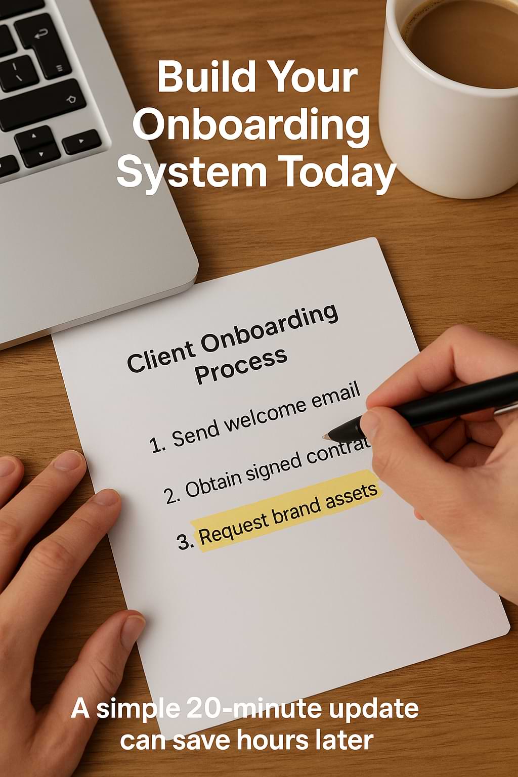 Right now: open a blank document titled “Client Onboarding Process.” Spend the next 20 minutes listing every step you currently take (from contract to first deliverable).