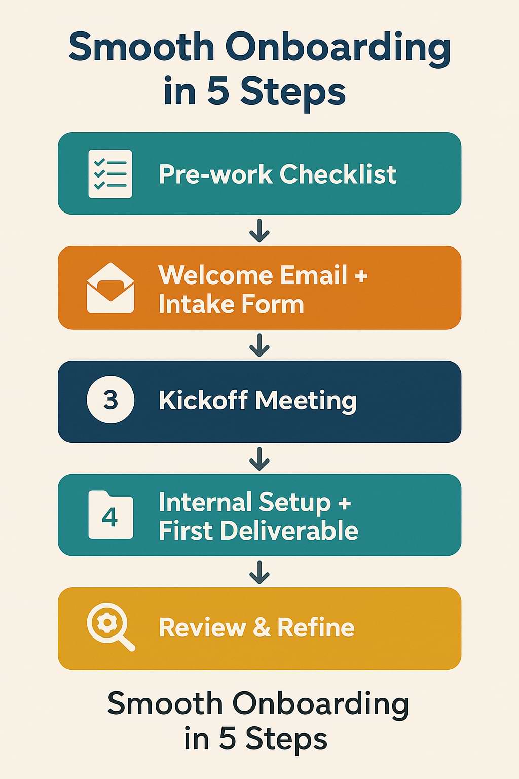 - Mistake 3: Treating onboarding as a one-time fix, not a system you refine. If you don’t refine your process based on experience, you may continue to encounter the same inefficiencies. Avoid by reviewing Step 5 after each onboarding.
