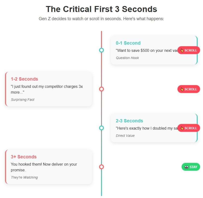 Gen Z scans content fast. Your first 3 seconds need to hook them, or they’ll scroll past. Start with a question, a surprising fact, or jump straight into the value you’re providing.